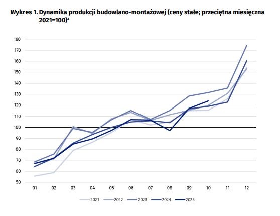W październiku 2025 r. odnotowano wzrost produkcji budowlano-montażowej w skali roku dla przedsiębiorstw wykonujących roboty budowlane specjalistyczne - o 7,8%, a także dla jednostek zajmujących się wznoszeniem obiektów inżynierii lądowej i wodnej oraz budynków - odpowiednio o 3,2% oraz 2,4%.