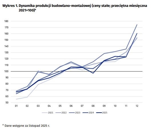 W porównaniu z miesiącem poprzednim, w listopadzie 2025 r. produkcja budowlano-montażowa zmniejszyła się w przedsiębiorstwach budujących obiekty inżynierii lądowej i wodnej (o 5,4%), natomiast zwiększyła się w jednostkach realizujących roboty budowlane specjalistyczne (o 3,8%) oraz zajmujących się wznoszeniem budynków (o 2,6%).