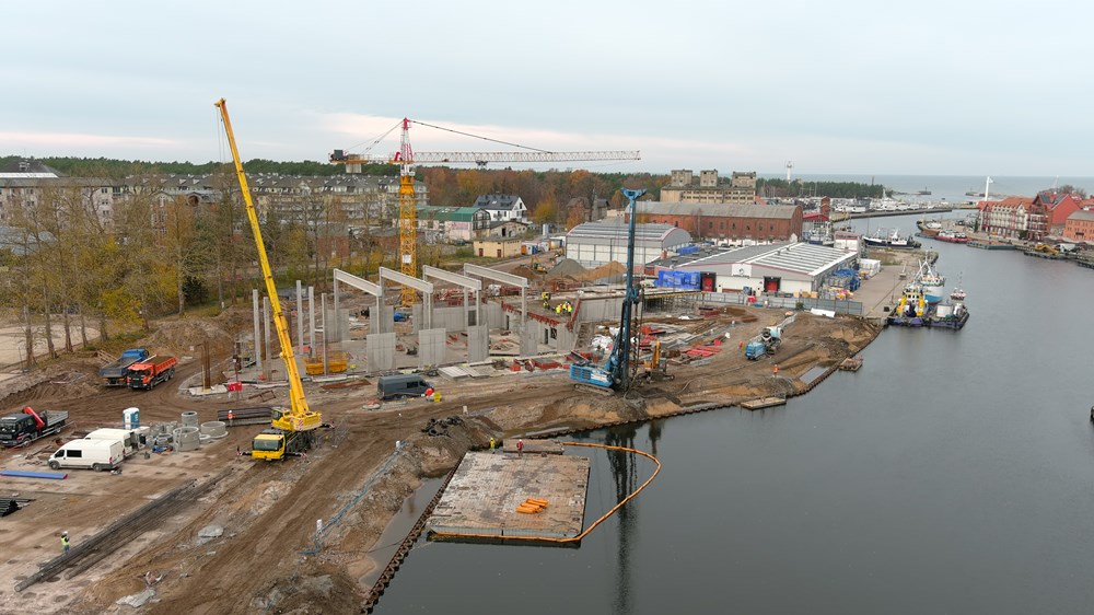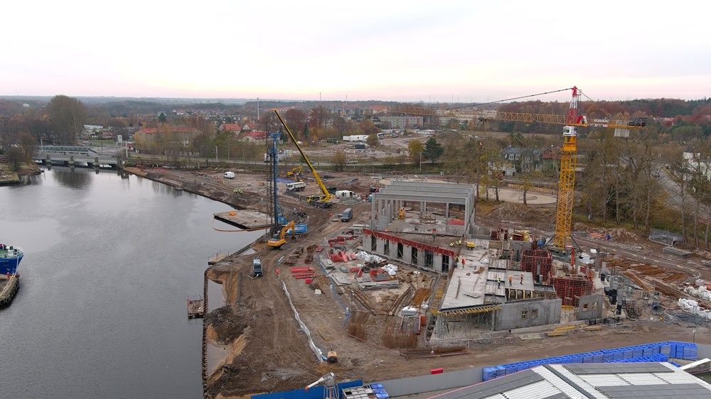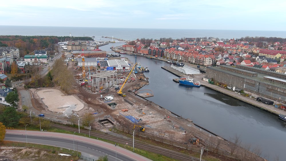 Budowlańcy kontynuują roboty przy placach manewrowych, obejmujące wykonanie sieci wodociągowych, sanitarnych, elektrycznych i teletechnicznych, a następnie betonów podkładowych, które przygotują teren pod docelowe nawierzchnie projektowane jako płyty betonowe, zbrojone włóknami stalowymi. Na obszarach przeznaczonych na docelowe ciągi komunikacyjne trwają prace związane z układaniem podbudowy drogowej, krawężników, obrzeży oraz kostki brukowej. Na nabrzeżu wykonano konstrukcję ścianki szczelnej, kotwionej mikropalami i zwieńczonej kleszczem stalowym. Po sprężeniu mikropali wykonano zasypy oraz platformy do pali żelbetowych wzdłuż nabrzeża. Rozpoczęto prace przygotowawcze dla prac żelbetowych w zakresie hydrotechnicznym.