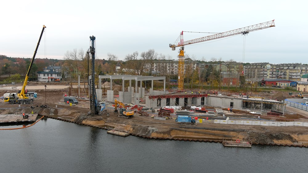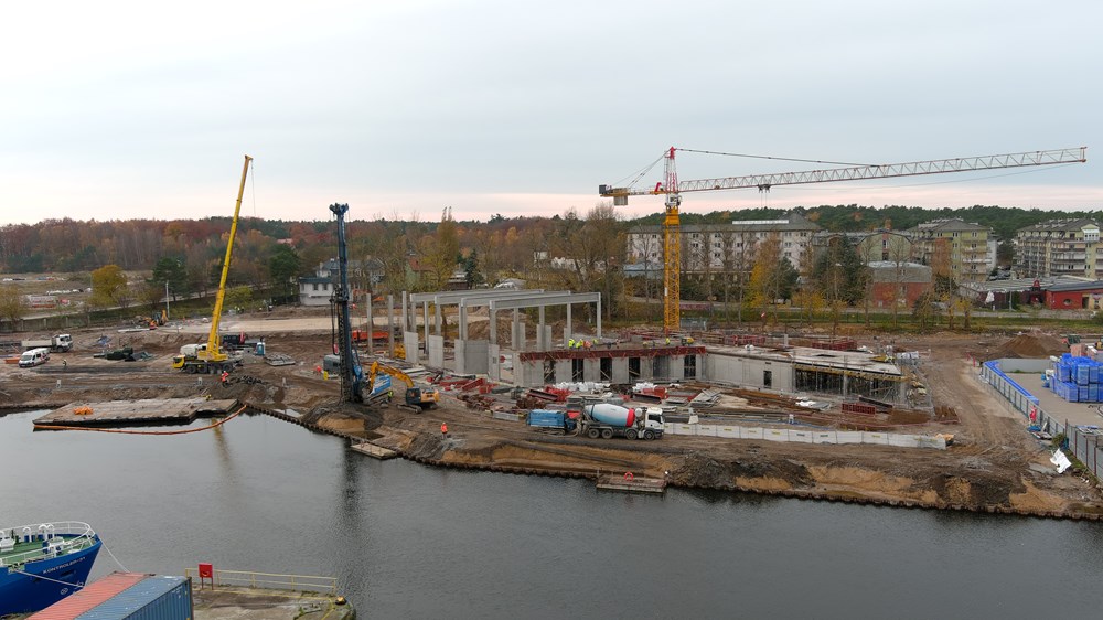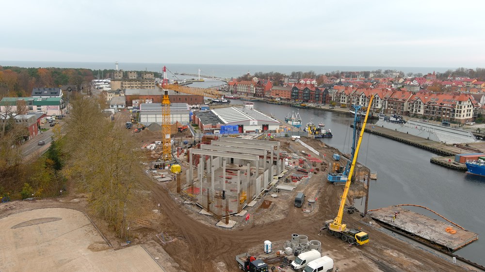 Na terenie budowy bazy operacyjno-serwisowej w Porcie Ustka prace postępują zgodnie z harmonogramem. Generalny Wykonawca zakończył już prace fundamentowe dla budynku biurowo-socjalnego i części magazynowej. Prace budowlane, związane ze wznoszeniem konstrukcji żelbetowych parteru, są na ukończeniu. Na budynku socjalno-biurowym rozpoczął się montaż płyt stropowych nad poziomem parteru. Wykonano także betonowanie pierwszej sekcji stropu nad poziomem 0. W listopadzie na terenie hali magazynowej na prefabrykowanych słupach żelbetowych zamontowano dźwigary strunobetonowe wieńczące konstrukcję hali magazynowej.