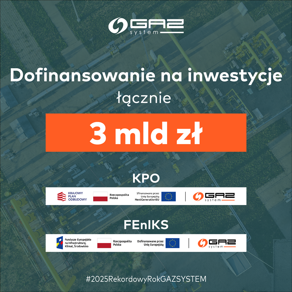 GAZ‑SYSTEM skutecznie pozyskał środki finansowe na realizację kluczowych inwestycji: 884,5 mln zł dofinansowania z UE w ramach programu FEnIKS oraz pożyczkę z BGK w wysokości 2,2 mld zł z KPO na realizację części lądowej Programu FSRU, co w praktyce umożliwia rozbudowę strategicznej infrastruktury przesyłowej i wzmacnia bezpieczeństwo energetyczne kraju.