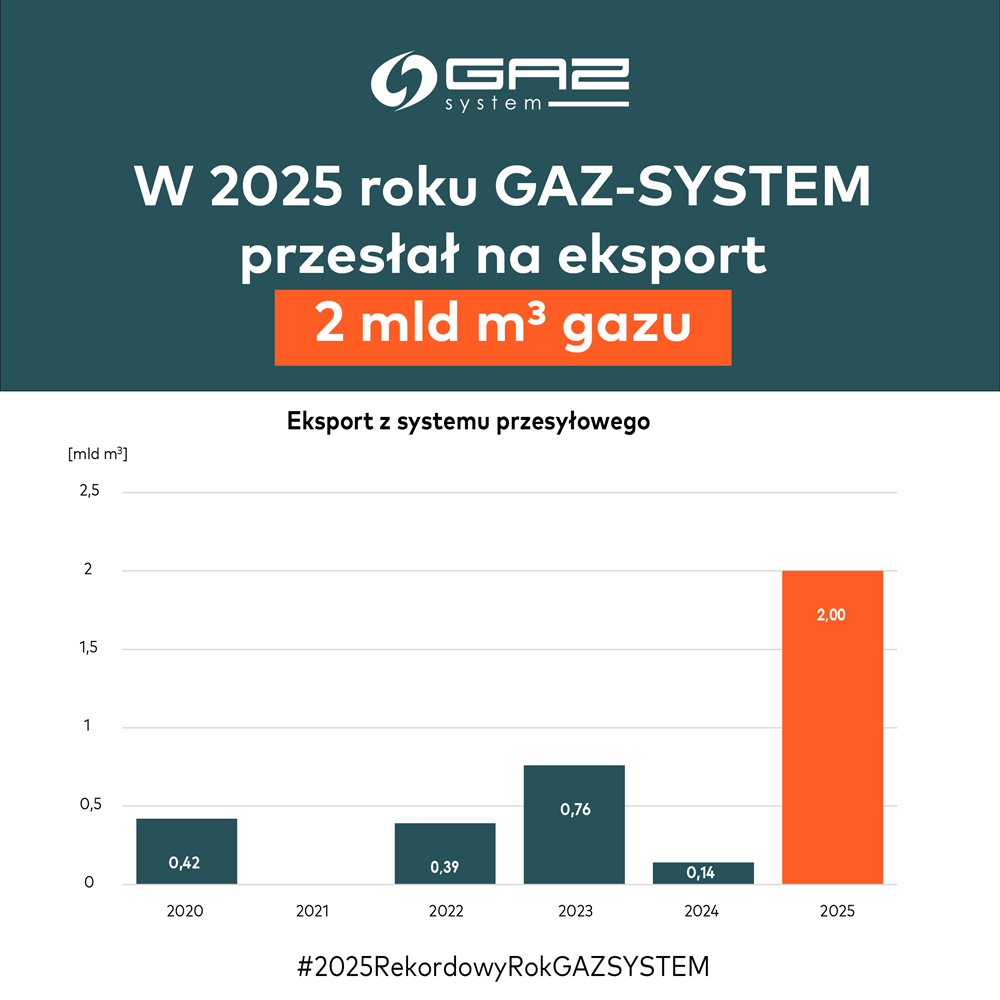 W 2025 roku GAZ-SYSTEM przesłał 22,8 mld m sześc. gazu - tym samym o 1,5 mld metrów sześc. poprawił najwyższy dotychczasowy wynik z 2021 roku, który wyniósł wówczas 21,3 mld m sześc. Z kolei wolumen eksportu wyniósł 2 mld metrów sześc. i zwiększył się o 0,7 mld m sześc. w porównaniu do ostatniego maksymalnego wyniku - 1,3 mld m sześc. z 2019 r. Głównym kierunkiem eksportu w minionym roku była Ukraina.