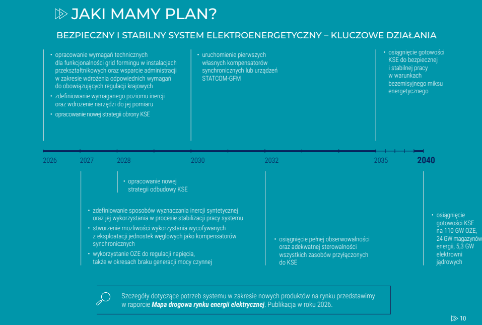 Operator systemu przesyłowego zamierza osiągnąć ten cel m.in. poprzez rozwój rynku usług systemowych, wykorzystywanie kompensatorów synchronicznych – urządzeń zapewniających odpowiednie parametry techniczne systemu – oraz dążenie do kształtowania pracy sieci (ang. grid forming) przez inwertery.