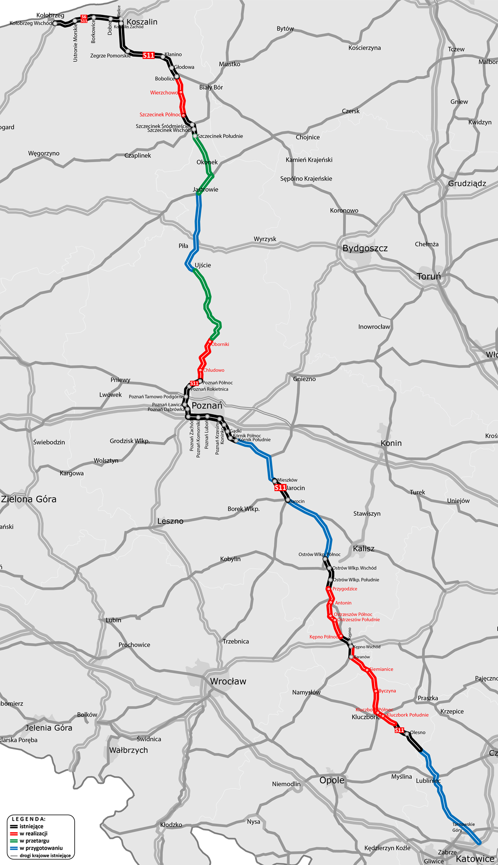 To w dużym skrócie opis stanu realizacji tej niezwykle ważnej dla trasy, wchodzącej w skład kompleksowej Transeuropejskiej sieci transportowej (TEN-T), ale leżącej poza europejskimi korytarzami transportowymi. Docelowo pokonanie trasy z Kołobrzegu do węzła Piekary Śląskie na połączeniu z autostradą A1 zajmie samochodem osobowym nieco ponad 5 godz. Dziś kierowcy mogą skorzystać z kilku istniejących fragmentów tej trasy. To wspólny przebieg z S6 od Kołobrzegu do Koszalina (ok. 35 km) i autostradą A2 na obwodnicy Poznania (ok. 16 km). W ciągu S11 oddano do ruchu trasę od Koszalina do Bobolic, obwodnicę Szczecinka, odcinki w okolicy Poznania oraz cztery kolejne obwodnice: Jarocina, Ostrowa Wielkopolskiego, Kępna i Olesna.
