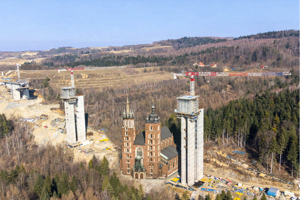Monumentalność ES‑26 najlepiej oddają porównania. Wieża bazyliki Mariackiej w Krakowie będąca jednym z najbardziej rozpoznawalnych symboli architektury, od lat dominuje w panoramie miasta i kojarzy się z potęgą oraz strzelistością gotyckiej formy. Tymczasem estakada, będąca przykładem nowoczesnej inżynierii, osiąga takie rozmiary, że pod jej najwyższą podporą można bez trudu wyobrazić sobie miejsce nawet dla tej zabytkowej wieży.