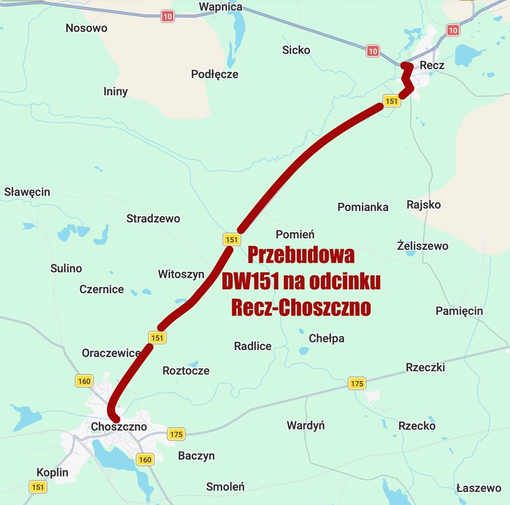 Oferty w przetargu na rozbudowę DW151 o długości 13,84 km poznamy 18 maja. W ramach prac wykonawca będzie musiał wykonać roboty rozbiórkowe, prace ziemne, wzmocnić podłoże, wykonać nową konstrukcję drogi i wybudować dwa ronda w miejscowościach Recz i Choszczno.