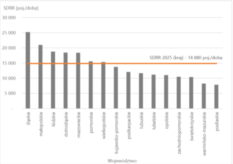 Wielkość ruchu jest zróżnicowana w poszczególnych województwach. Największy średni dobowy ruch na drogach krajowych, przekraczający 25 tys. poj./dobę, GDDKiA zarejestrowała w woj. śląskim. Z kolei najmniej obciążone ruchem były drogi w woj. podlaskim, gdzie SDRR był prawie o połowę mniejszy od średniej dla całego kraju i wyniósł 7865 poj./dobę.