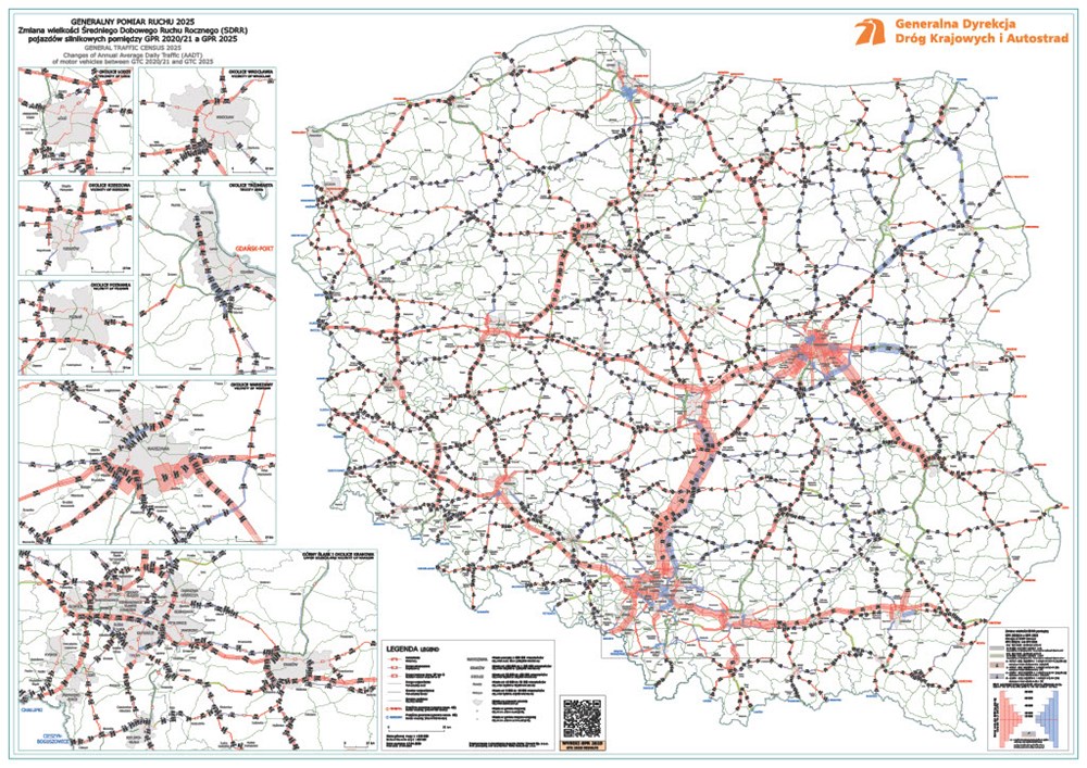 W GPR 2025 na wielu odcinkach wystąpiły istotne zmiany w wielkościach ruchu drogowego, przy czym w dużej mierze wynikają one z ukończenia kluczowych inwestycji drogowych lub prowadzonych w 2025 r. prac budowalnych. Te zakończone inwestycje to