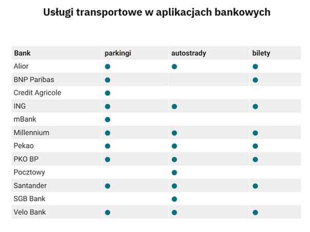 Czy usługi transportowe w aplikacjach bankowych są w Polsce powszechne? Z zebranych danych wynika, że tak. Na kilkanaście instytucji finansowych, które o to zapytałem, zaledwie jedna odpowiedziała, że na razie nie oferuje takich usług – był to Nest Bank. Jednocześnie jednak podmiot nie wykluczył, że w przyszłości wprowadzi takie rozwiązania. Co oferują pozostali?