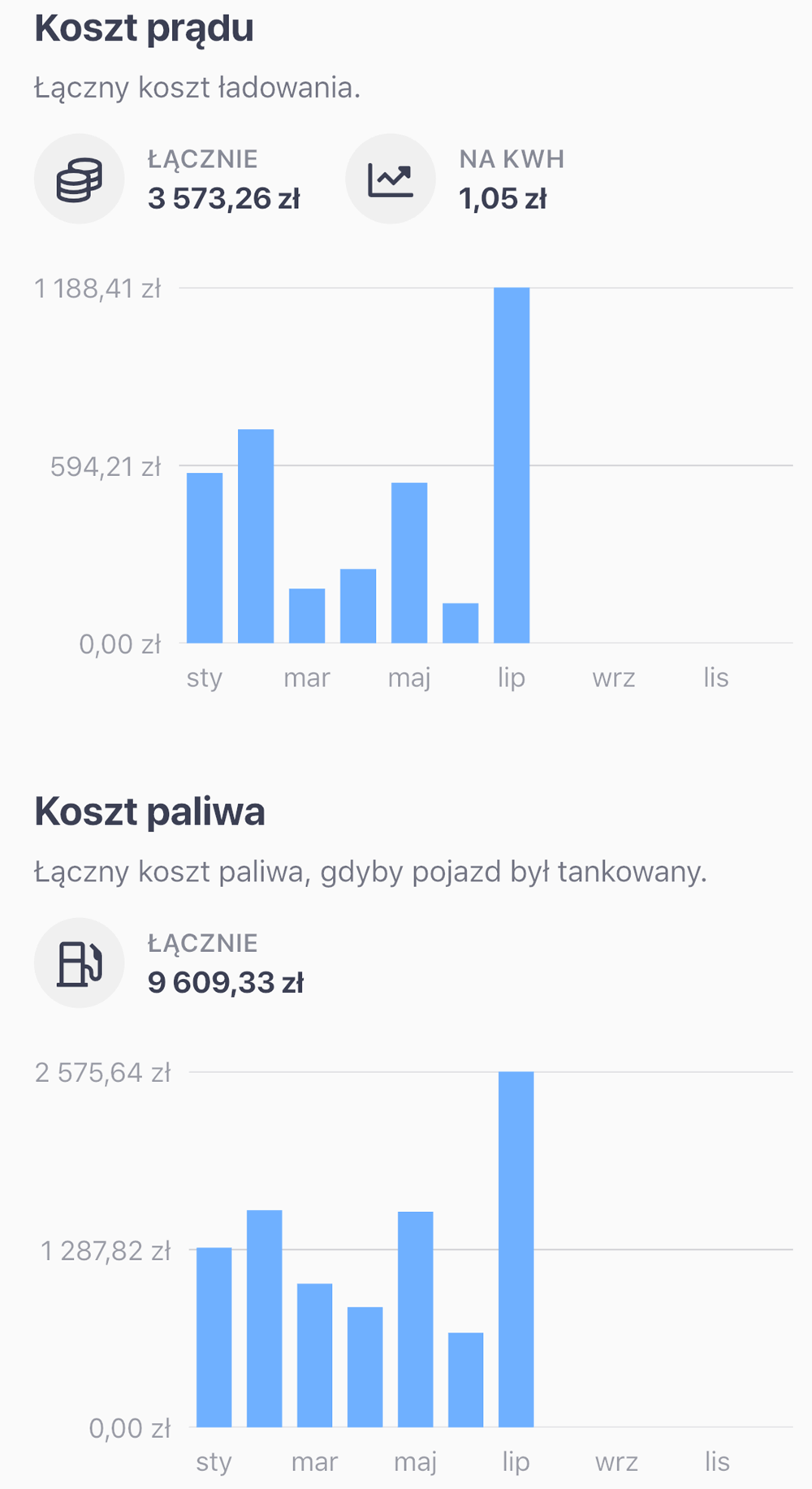 Użytkownik w domu korzysta z ładowarki trójfazowej o mocy 7,4 kW, a w trasie z szybkich ładowarek, zwykle o mocy ponad 100 kW. Według niego średni realny zasięg auta na polskich drogach ekspresowych i krajowych to około 360 km, a na autostradzie – przy jeździe z maksymalną dopuszczalną w Polsce prędkością oraz niemal do całkowitego rozładowania baterii, to około 300 km. Jak dodaje Pan Maciej, koszty energii w porównaniu do zakupu paliwa są średnio ponad dwukrotnie niższe niż wcześniejsze wydatki na paliwo, zaś ładowania w domu pozwalają mu obniżyć koszty podróżowania do mniej niż 10 zł za każde pokonane 100 km.