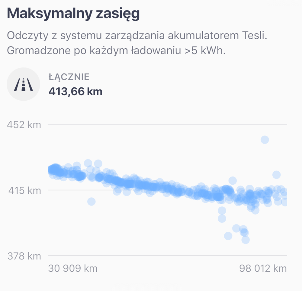 – Zasięg mojego auta po przejechaniu 100 tys. km i ponad 3 latach ciągłej eksploatacji to około 414 kilometrów – czyli tylko nieco mniej niż fabryczne 438 km. Degradacja baterii wyniosła do tej pory ok. 5%, co jest zgodne ze średnią globalną dla tego modelu – mówi Pan Maciej. – Od przebiegu około 70 000 km praktycznie nie obserwuję dalszego spadku pojemności baterii. Jeżdżę dużo, około 30 tys. kilometrów rocznie. Z danych gromadzonych przez mój samochód w długim terminie wynika, że nieco ponad 50% ładowań odbywa się w domu, średnio raz w tygodniu. Pozostałe w trasie – dodaje.