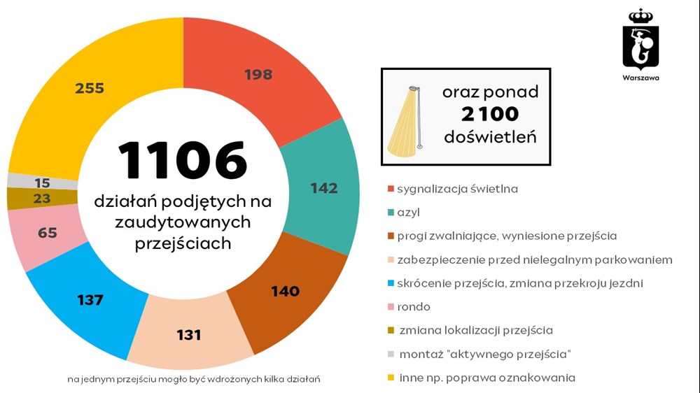 Bezpieczeństwo na przejściach dla pieszych traktujemy zawsze priorytetowo. Wykorzystując przyznane przed rokiem przez Radę Miasta środki na ten cel, wdrożyliśmy w zeszłym roku zmiany kilkudziesięciu najniebezpieczniejszych przejściach w Warszawie. Tym samym połowa przejść określonych jako priorytetowe jest już znacznie bezpieczniejsza. W międzyczasie przygotowaliśmy zmiany – a w wielu przypadkach rozpoczęliśmy ich wdrażanie – dla pozostałej połowy.