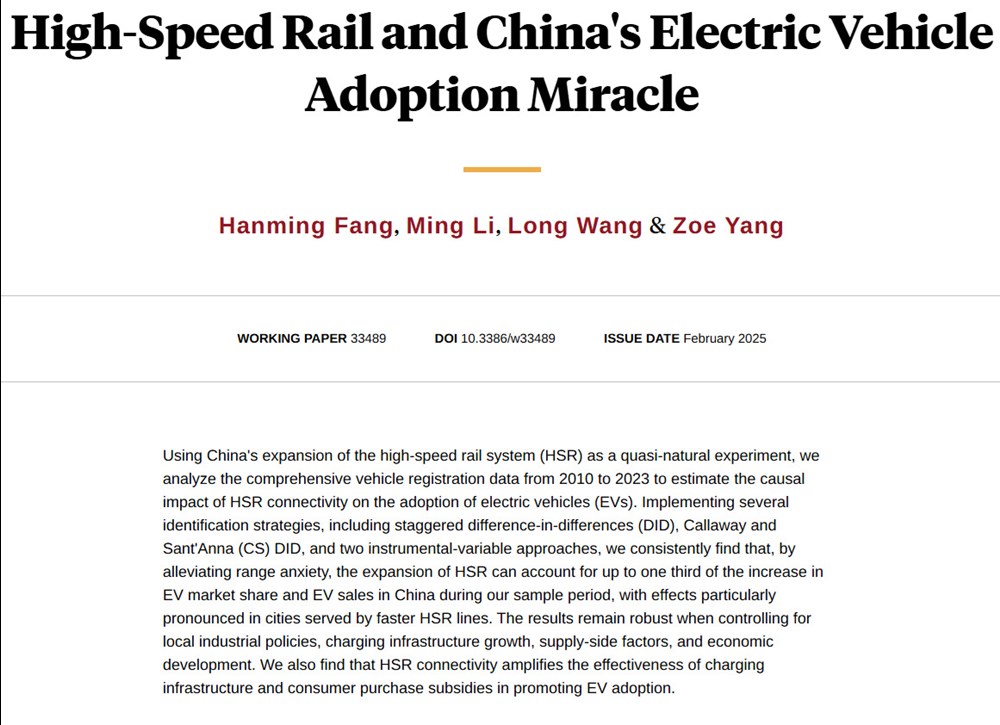 „Wykorzystując ekspansję chińskiego systemu kolei dużych prędkości (HSR) jako swoisty eksperyment naturalny, analizujemy kompleksowe dane dotyczące rejestracji pojazdów od 2010 do 2023 roku, aby oszacować przyczynowy wpływ rozwoju HSR na obecność pojazdów elektrycznych (EV) na rynku. Stosując różne strategie identyfikacji […] stwierdzamy, że ekspansja HSR, łagodząc obawy dotyczące ograniczonego zasięgu pojazdów elektrycznych, może odpowiadać za około jedną trzecią wzrostu udziału pojazdów elektrycznych na rynku oraz wzrostu ich sprzedaży w Chinach w okresie objętym badaniem. Efekty te są szczególnie widoczne w miastach obsługiwanych przez szybsze linie HSR. Wyniki pozostają stabilne po uwzględnieniu lokalnej polityki przemysłowej, rozwoju infrastruktury ładowania, czynników po stronie podaży oraz ogólnego wzrostu gospodarczego. Zauważamy także, że rozwój łączności HSR wzmacnia efektywność infrastruktury ładowania oraz programów dopłat do zakupu pojazdów elektrycznych w promowaniu wprowadzania ich na rynek.” (tłum. red.)