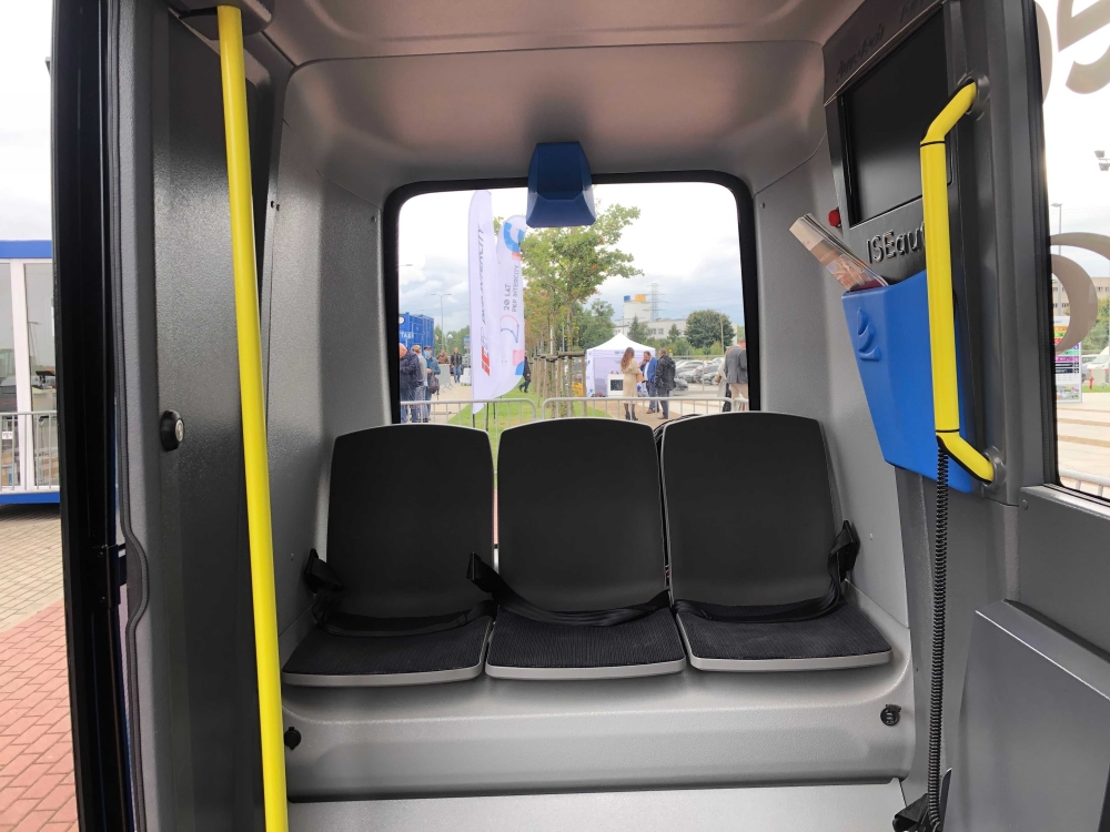 Pojazd ma osiem miejsc siedzących. Jest w pełni elektryczny, a jego zasięg wynosi 60 km. Będziemy operować cały dzień – zakładamy pokonywanie ok. 40 km w ciągu doby. W środku znajdują się trzy ekrany informacyjne, do tego dochodzą przyciski bezpieczeństwa, które pozwolą zatrzymać pojazd. Samochód jest wyposażony w system lidarów i czujników, cztery kamery zewnętrzne i jedną wewnętrzną. W środku są też pasy bezpieczeństwa – rekomendujemy ich stosowanie.