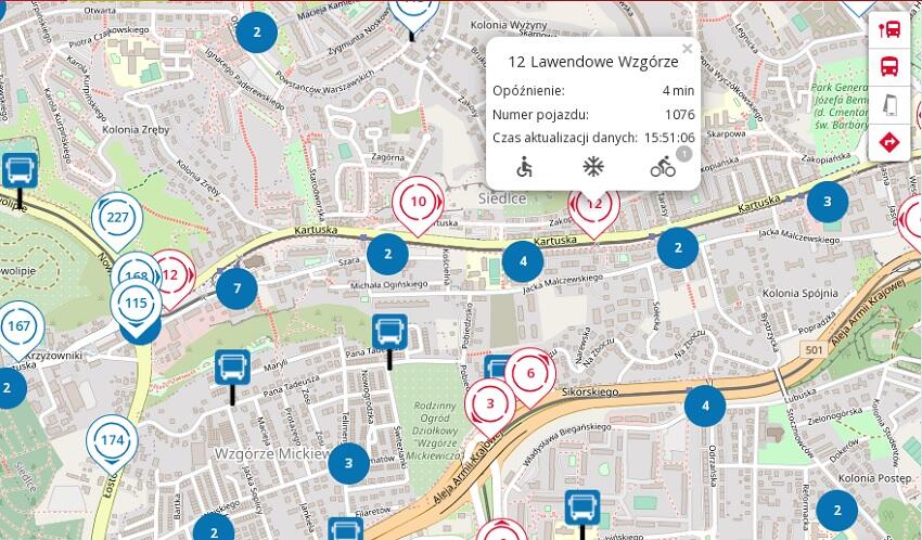 Po kliknięciu w “pinezkę”, wyświetlą się też atrybuty związane z wyposażeniem autobusu lub tramwaju. Dzięki temu dowiemy się, czy w pojeździe znajduje się np. rampa dla wózków lub uchwyty do przewozu rowerów. Pojawi się też informacja, ile takich mocowań jest. Wielbicieli komunikacji miejskiej ucieszy wyświetlająca się wraz z powyższymi danymi informacja o numerze taborowym pojazdu.