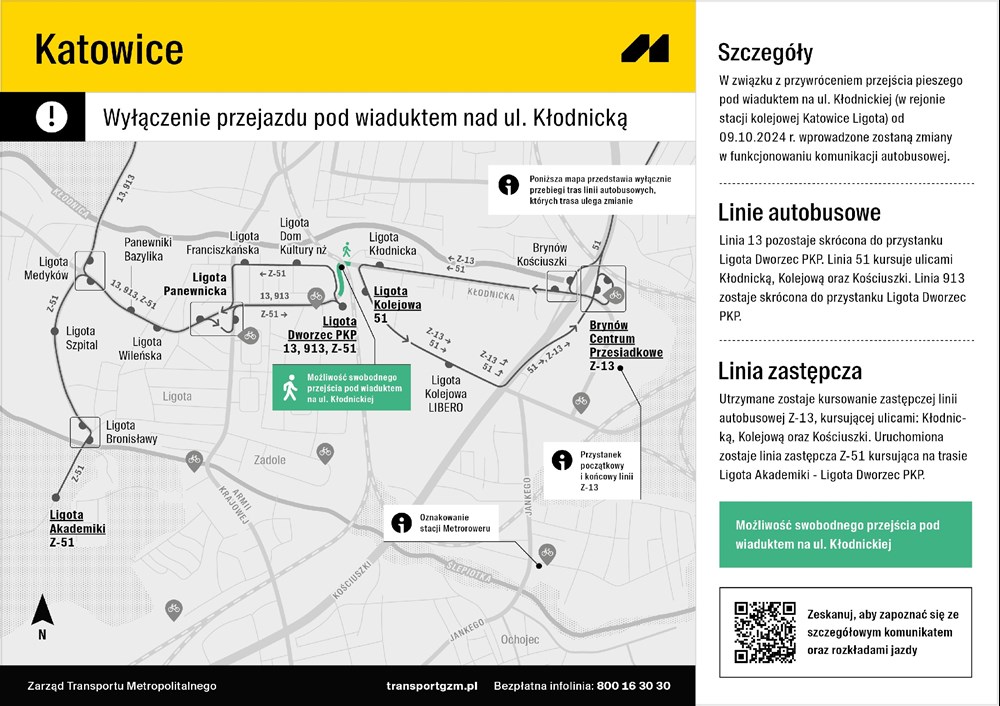 Do tej pory pasażerowie komunikacji miejskiej chcący przejechać pomiędzy Ligotą a Brynowem korzystali z linii 51 i 913, których trasy musiały zostać poprowadzone okrężnie przez Piotrowice i Ochojec. Od najbliższej środy, dzięki otwarciu przejścia dla pieszych pod wiaduktem przebiegającym nad ul. Kłodnicką, będzie można wysiąść na przystanku Ligota Dworzec PKP, przejść pieszo pod remontowanym wiaduktem kolejowym na przystanek Ligota Kolejowa i stąd kontynuować podróż m.in. w kierunku Brynowa i centrum miasta. W tym celu będzie można skorzystać z linii 51 lub Z-13. Podróż w drugą stronę będzie przebiegać analogicznie, tyle że na przystanku Ligota Dworzec PKP, aby dojechać np. na Panewniki lub akademiki, będzie można skorzystać z linii 13, 913 i Z-51.