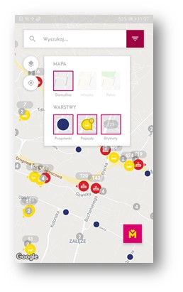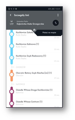 Wskazania pozycji pojazdów na mapieW aplikacji prezentowana jest również bieżąca lokalizacja wszystkich pojazdów na podkładzie mapy obejmującej obszar, na którym organizatorem komunikacji jest Zarząd Transportu Metropolitalnego wyskalowanej i wycentrowanej w oparciu o współrzędne GPS. Pasażer ma możliwość podglądu bieżącej pozycji konkretnego pojazdu lub pojazdów obsługujących wskazaną przez pasażera linię. Możliwy jest również podgląd bieżącej pozycji wszystkich pojazdów na wskazanym obszarze ograniczonym jedynie możliwością czytelnej prezentacji, na ekranie urządzenia, którym posługuje się pasażer. Aplikacja umożliwia śledzenie pozycji wybranego pojazdu wraz z bieżącą informacją na jego temat: nr linii, numer boczny pojazdu, odchyłki od planowanego rozkładu jazdy – prezentowanej w minutach i w odpowiednim kolorze, uzależnionym od tego czy dany pojazd jest przyspieszony, jedzie o czasie, czy też jest opóźniony w stosunku do planowanego rozkładu jazdy. Dodatkowo przy śledzonym pojeździe prezentowana jest informacja o kierunku w jakim się porusza (w postaci strzałki przy symbolu pojazdu lub w formie opisowej, jako ostatni przystanek w realizowanym kursie), najbliższym przystanku na trasie oraz czasie jaki upłynął od ostatniego logowania pojazdu w systemie.