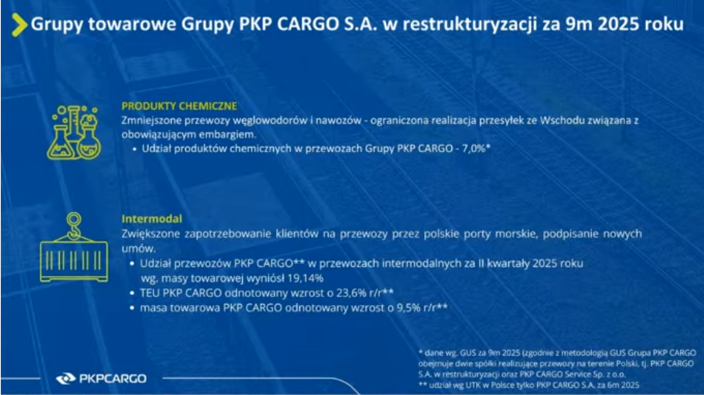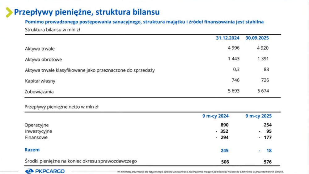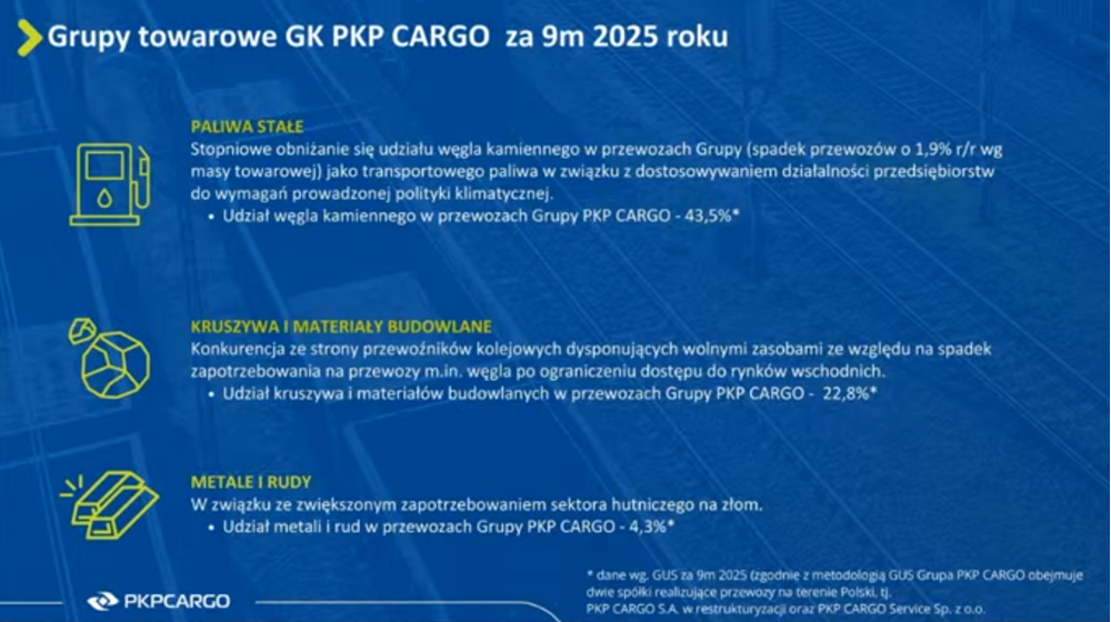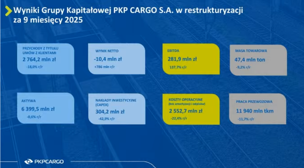 PKP Cargo zamknęło trzeci kwartał 2025 roku z wyraźną poprawą kluczowych wskaźników finansowych, potwierdzając skuteczność realizowanej restrukturyzacji. Spółce udało się ustabilizować przepływy pieniężne, ograniczyć koszty operacyjne oraz poprawić wyniki EBITDA i EBIT, co – mimo spadku przychodów oraz wolumenów przewozowych – wyznacza stabilizujący trend i tworzy podstawę do odbudowy pozycji rynkowej.