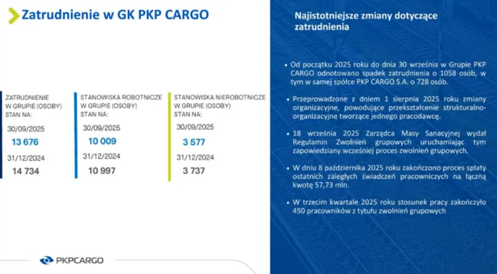 PKP Cargo stara się ograniczać nakłady inwestycyjne, by odzwierciedlały potrzeby przewozów oraz rynku, ale też musiał zmierzyć się ze sprawą zwolnień grupowych. Przez dziewięć pierwszych miesięcy 2025 roku odnotowano w grupie spadek zatrudnienia o 1058 osób, co stanowi ok. siedem procent – z tego aż 450 pracowników zakończyło stosunek pracy z tytułu zwolnień grupowych w III kwartale. 8 października natomiast zakończono proces spłaty ostatnich zaległych świadczeń pracowniczych na łączną kwotę 57,73 mln zł.