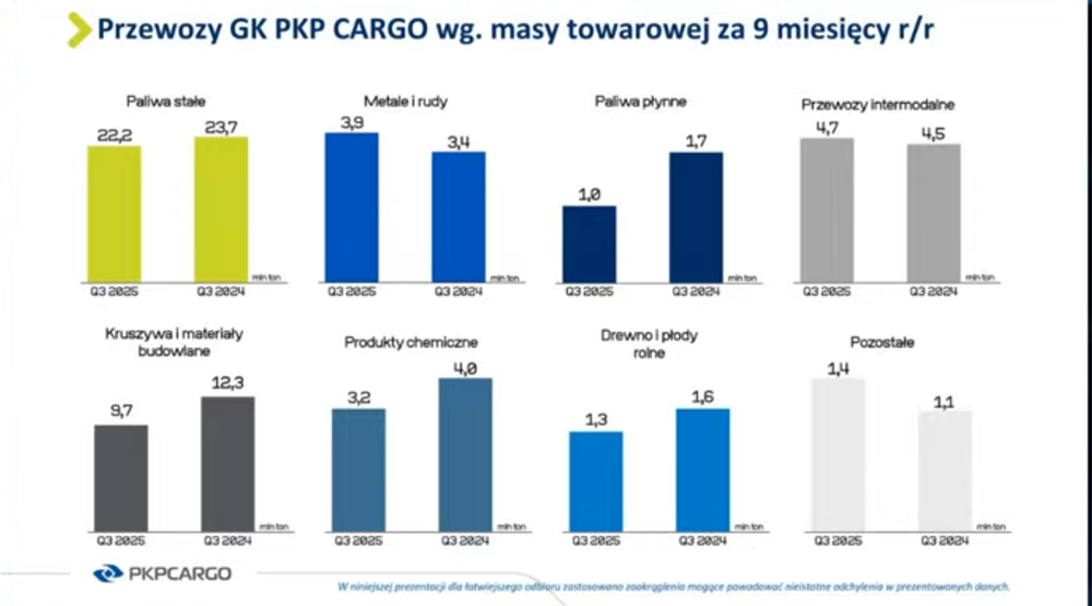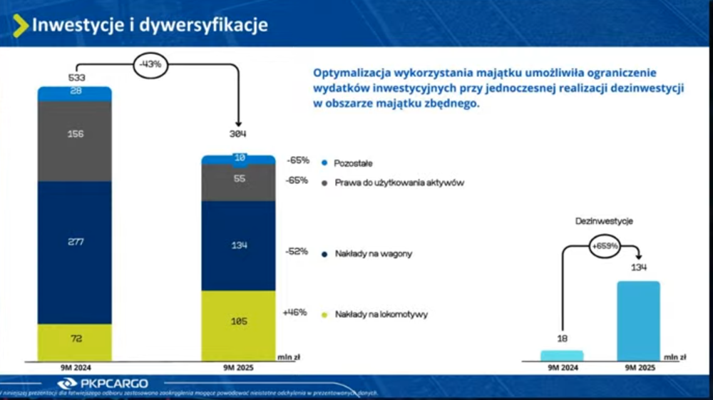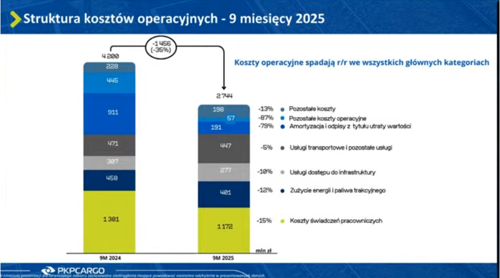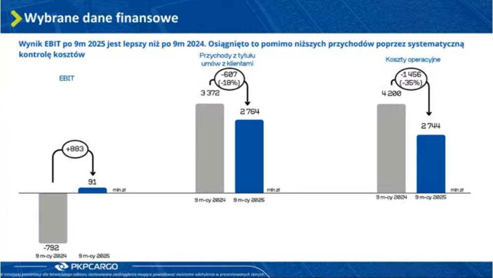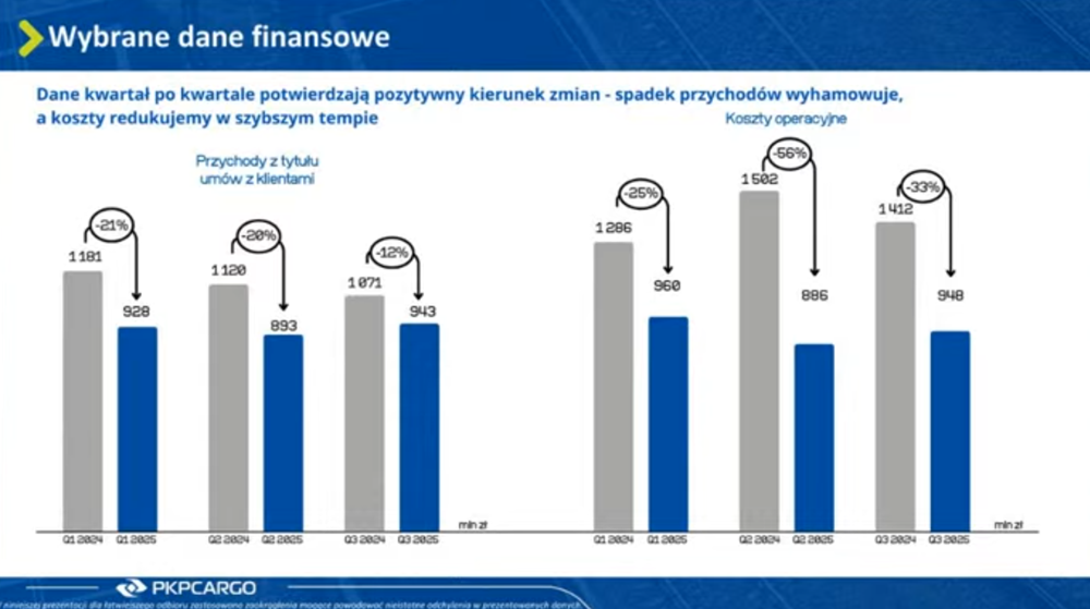 – W III kwartale zrealizowaliśmy to wobec nadal gorszych wyników i zmniejszenia wolumenu pracy przewozowej i masy towarowej w zakresie r/r widzimy, że mimo tego, że przychody spadły o 18 procent to możemy powiedzieć, że jest to związane ze świadomą polityką sprzedażową, co ma odzwierciedlenie w wynikach. Mimo takiego rynku i przychodów jak na poziomie EBITDA 281,9 mln czy kosztów operacyjnych 2 552,7 mln obserwujemy znaczące ograniczenie kosztów lub polepszenie wyniku zysku netto i na poziomie operacyjnym – streścił.