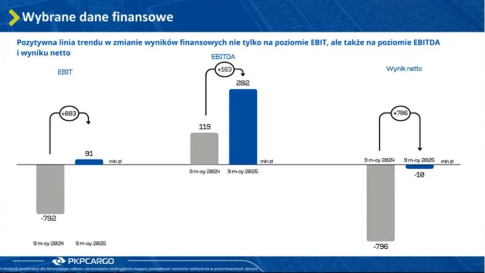 Jeśli chodzi natomiast o konkretne wyniki, PKP Cargo zanotowało wzrost wyniku EBIT. Po 9 miesiącach r/r jest to wzrost o 883 mln zł, co przełożyło się na dodatni wynik na poziomie 91 mln zł. Wynik EBITDA poprawił się z kolei o 163 mln ze 119 do 282 mln zł, a wynik netto o 786 mln zł, mimo że dalej jest lekko na minusie i wyniósł po trzech kwartałach stratę 10 mln.