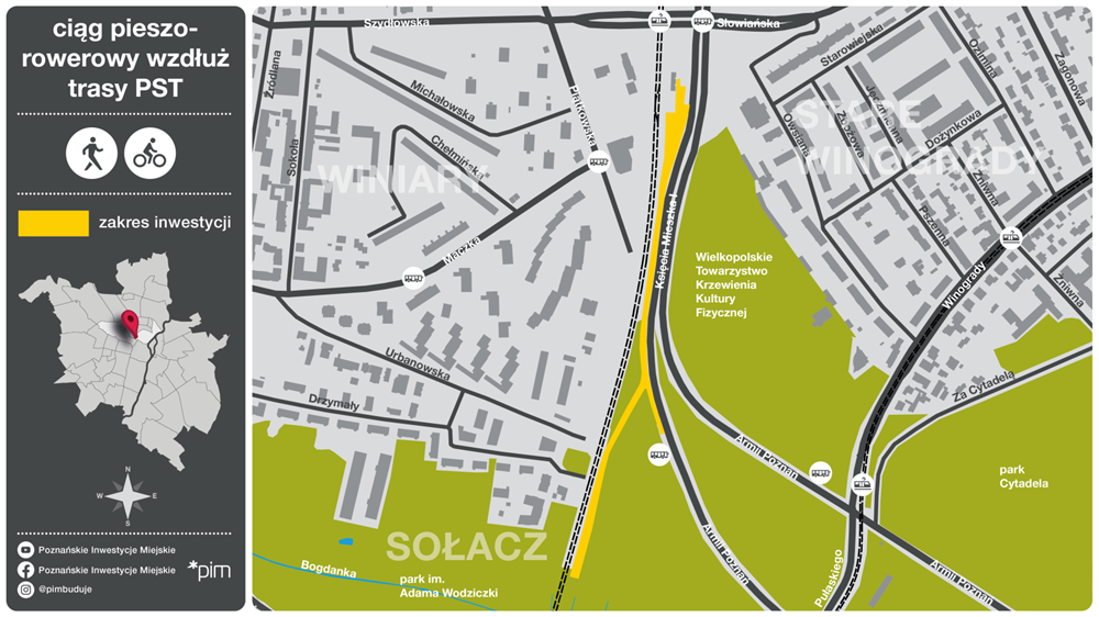 – W zakres zadania wchodzi budowa komfortowej drogi rowerowej w pasie pomiędzy jezdnią ul. Księcia Mieszka I a torowiskiem PST. Wzdłuż niej wybudowany zostanie także chodnik. Trasa będzie oświetlona, powstanie również kanał technologiczny. To pierwszy etap bardzo ważnej inwestycji dla rowerzystów z Winograd i Piątkowa, w kolejnych krokach będzie można wybudować nową drogę wzdłuż całej trasy PST, od os. Sobieskiego do mostu Teatralnego – zapowiada Marcin Gołek, wiceprezes spółki Poznańskie Inwestycje Miejskie.