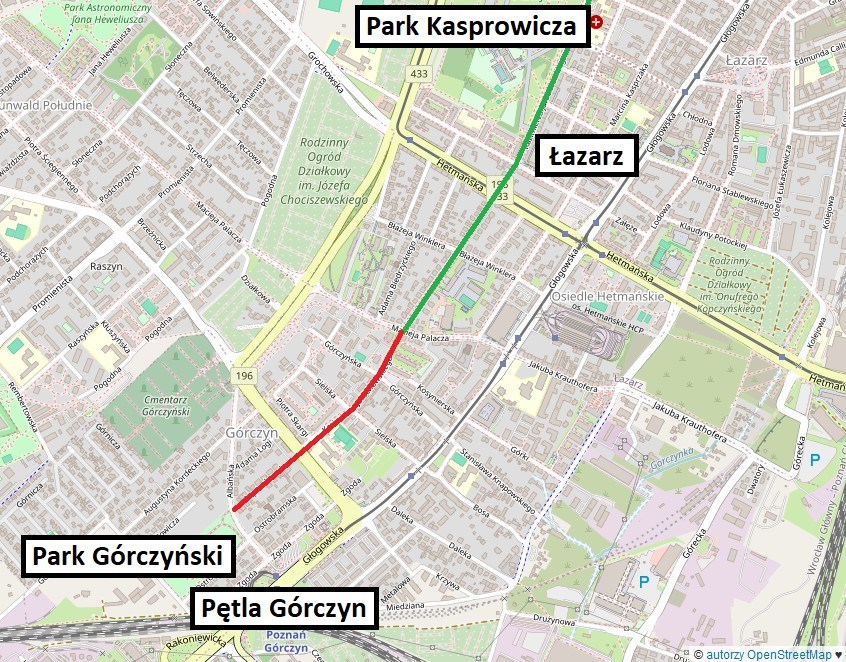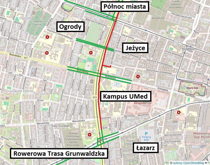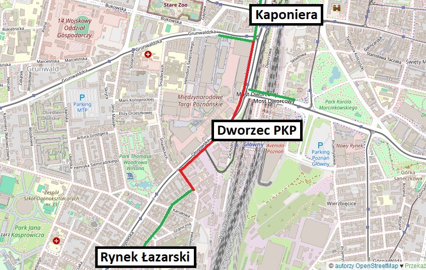 KR: Zdecydowanie trasa na Łazarzu. Tu znowu mówimy o inwestycji, która nie jest już taka prosta i którą można zrealizować niskokosztowo. Istniejąca infrastruktura rowerowa na Łazarzu kieruje rowerzystów do ulicy Grunwaldzkiej, przez co o ile Górny Łazarz ma dobre połączenie z centrum, o tyle Dolny Łazarz nie ma go właściwie wcale. Mamy ulicę Głogowską, która na odcinku od Parku Wilsona do Dworca Zachodniego jest w zasadzie nieprzejezdna dla rowerzystów. Jest to nieprzekraczalna bariera dla wielu osób, które chciałyby skorzystać z dojazdu rowerem w rejon dworca, Kaponiery. Przypomnę, że mamy tam dwa pasy ruchu w każdą stronę, co nie zachęca do jazdy rowerem. W tym przypadku mamy dwie opcje tego, jak rozwiązać dojazd z D. Łazarza do centrum. Jedna z koncepcji, która narodziła się przy okazji rozmowy o budowie tzw. Dolnej Głogowskiej, mówi o tym, żeby przebić ulicę Małeckiego do ulicy Zachodniej i tędy wprowadzić rowery na Głogowską. Miasto nie dysponuje wspomnianymi terenami i musiałoby je wykupić pod to przebicie ulicy. Druga kwestia to ulica Głogowska a bardziej węzeł Most Dworcowy, który wymaga porządnej i przemyślanej przebudowy. W tym rejonie jakieś inwestycje na pewno będą prowadzone w ramach nowej stacji i dworca Poznań Główny, choć wiemy, że to perspektywa co najmniej 10 lat. Natomiast już dziś powinniśmy podejmować pewne decyzje i rozmowy z myślą o tym, jak ma to wyglądać docelowo.