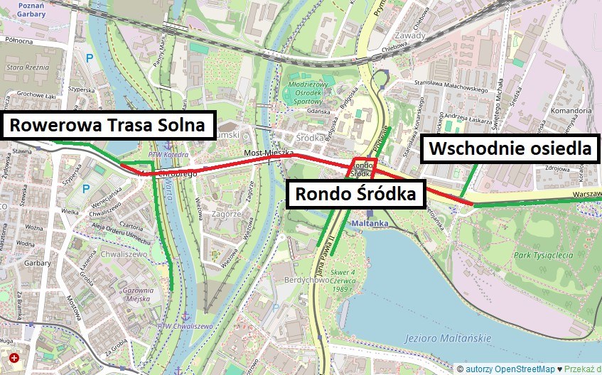 KR: Tak, mamy już skończoną rowerową Trasę Solną i zakończone projektowanie drogi rowerowej na Moście Chrobrego, natomiast po zakończeniu tych inwestycji rowerzyści będą trafiać na ścianę w postaci braku dobrej infrastruktury na odcinku od Katedry do Ronda Śródka i dalej w kierunku osiedla Warszawskiego. To zadanie także ma wykonaną koncepcję, natomiast w tym przypadku nie toczą się aktualnie żadne prace projektowe, a zadanie zamknięto w szufladzie. Realizacja tej inwestycji zamknęłaby nam temat północnej trasy średnicowej, a więc jednej z głównych tras zapisanych w Programie Rowerowym Miasta Poznania.