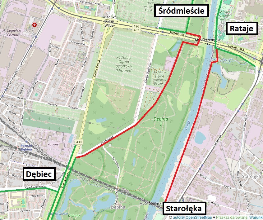 Dlatego postulujemy wydłużenie Wartostrady zarówno na południe - od Hetmańskiej po wałach przeciwpowodziowych na Dębiec oraz od Hetmańskiej do Starołęki Wielkiej jak i na północ, od Mostu Lecha do kładki w Owińskach oraz planowanej kładki w Czerwonaku.