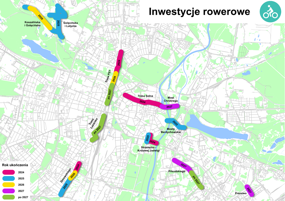 Do tych 409,5 kilometra można doliczyć dwie inwestycje, które właśnie są kończone - to Trasa Solna (etap 1 i 2) oraz droga dla rowerów przy ul. Dmowskiego (między ulicami Potockiej i Hetmańską). Obie te trasy będą kontynuowane. Aktualnie trwa budowa 3 etapu trasy wzdłuż Dmowskiego - od Krauthofera do Miedzianej - trwają też rozmowy z inwestorem zewnętrznym w sprawie realizacji etapu 2 (odcinek Krauthofera - Hetmańska). W tej kadencji ma być wykonana również tzw. Trasa Łazarska w stronę MTP. Z kolei w przypadku Trasy Solnej trwają prace projektowe mostu Chrobrego wraz z infrastrukturą rowerową od ul. Chwaliszewo do mostu Mieszka I.
