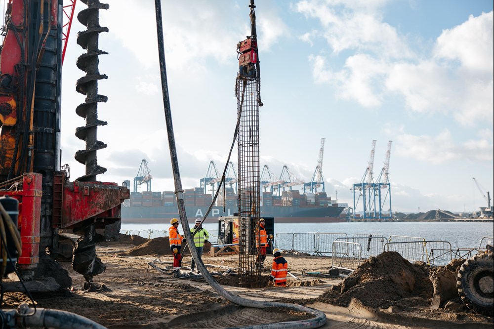Prace fundamentowe realizowane przez Soletanche Polska obejmują wykonanie kilku typów pali CFA pod płytę nabrzeża oraz belkę podsuwnicową. Technologia pali ciągłych wierconych CFA okazała się w tym przypadku najefektywniejsza.