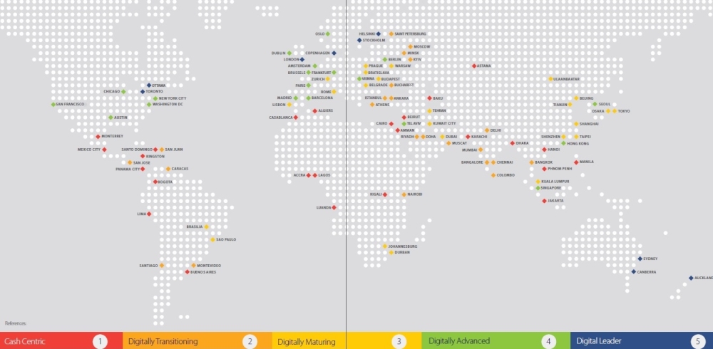 Analitycy z nowojorskiej firmy badawczej Roubini ToughtLab zebrali dane ze stu miast na całym świecie, dotyczące sposobów płatności i popularności, a także perspektyw dla płatności bezgotówkowych. W sześciu miastach (Lagos, Bangkok, Sao Paulo, Tokio, Chicago i Sztokholm) przeprowadzili po kilkaset ankiet z mieszkańcami, przedsiębiorcami i urzędnikami. W pozostałych miastach (m.in. w Warszawie), skorzystali z ogólnodostępnych danych. W efekcie podzielili miasta na pięć kategorii, od gotówkocentrycznych (głównie metropolie afrykańskie i łacińskie), do liderów innowacji (pojedyncze miasta w Europie, Kanadzie, Australii, choć żadnego amerykańskiego). Warszawa znalazła się w środkowej kategorii miast „dorastających cyfrowo” („digitally maturing”).