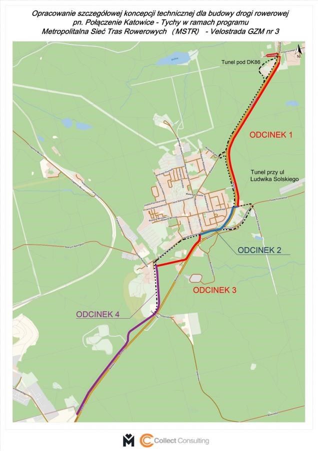 Trasa w Katowicach ma rozpoczynać się w Giszowcu, w rejonie ul. Górniczego Stanu i ul. Pszczyńskiej. Tam powstanie tunel pieszo-rowerowy, który umożliwi bezkolizyjny przejazd pod DK86. Dalej velostrada pobiegnie wzdłuż wschodniej strony DK86, aż do ul. Solskiego w Murckach, gdzie planowane jest wykorzystanie istniejącego przejścia podziemnego i budowa nowego odcinka po stronie zabudowań mieszkalnych. Całość inwestycji podzielono na cztery sekcje, obejmujące m.in. kładki nad łącznicami ul. Bielskiej w rejonie ronda Książąt Pszczyńskich.