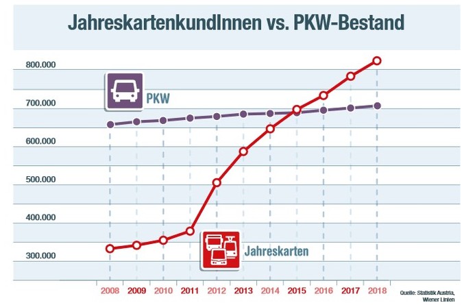Źródło: Wiener Linien. Na grafice przedstawiono sprzedaż biletów rocznych w zestawieniu z liczbą zrejestrowanych samochodów. Wyraźnie widoczny jest efekt obniżenia ceny.Utrzymaniu się stałej liczby pasażerów korzystających z biletów długookresowych, a zwłaszcza rocznych, towarzyszy spadek liczby zarejestrowanych w mieście samochodów. Władze austriackiej stolicy podkreślają, że to efekt wdrażanej od lat polityki mobilności, która stawia na promowanie ruchu pieszego, rowerowego i transportu zbiorowego i zniechęcanie do korzystania ze szkodliwych dla środowiska aut.