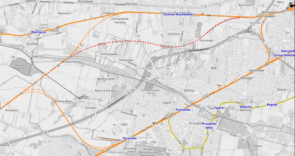 map. OpenRailwayMap. - Na mapie widać łącznicę od Parzniewa do linii KDP (linia nr 85)