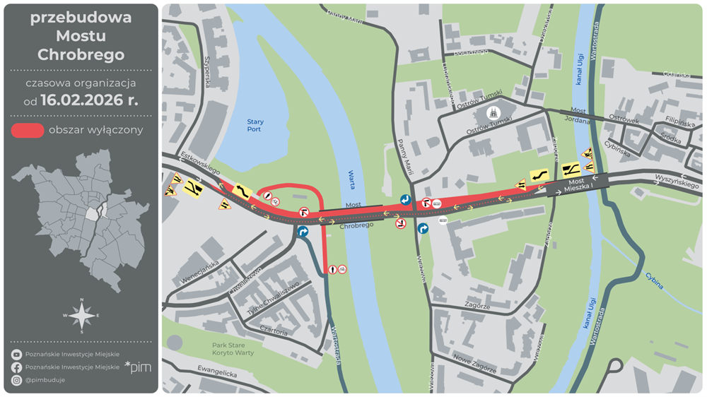 Jeśli nic się nie wydarzy, od poniedziałku – po porannym szczycie komunikacyjnym – ruch na moście dla samochodów jadących od Śródki w stronę centrum miasta będzie wyłączony, a przejazd w obu kierunkach będzie odbywał się nitką południową. Jezdnia w stronę centrum zostanie wyłączona na odcinku od Mostu Mieszka I do okolicy ul. Szyperskiej.