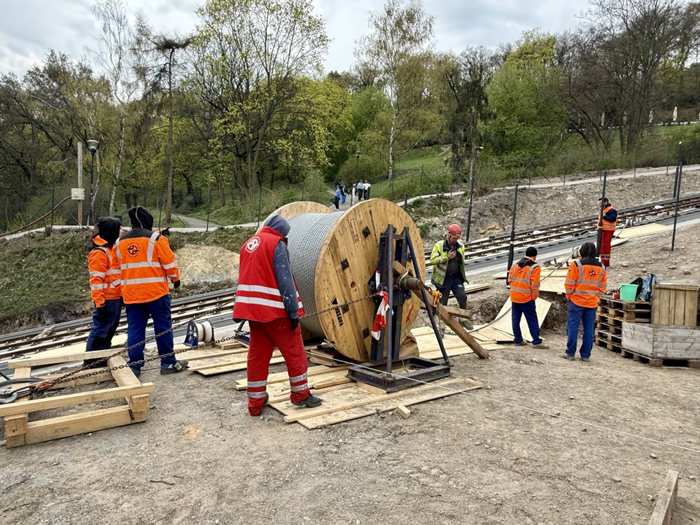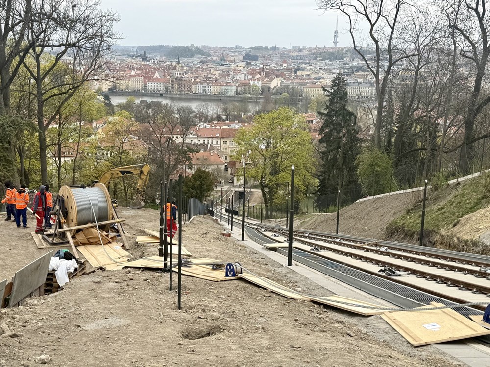 W najlepsze trwa remont kolejki na słynne wzgórze Petřín. Dopravní podnik hl. m. Prahy (DPP) zaprezentował najnowsze zdjęcia z prac. Wykonawca zamontował już linę nośną i ustawił dwa wagony, które będą obsługiwały naprzemiennie trasę.
