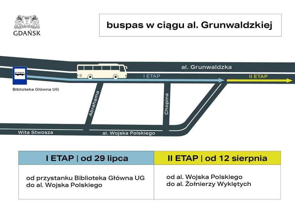 – W miesiącach letnich chcielibyśmy sprawdzić i przetestować buspas w ciągu al. Grunwaldzkiej. W poniedziałek, 29 lipca, w pierwszym etapie uruchomimy buspas, od przystanku Biblioteka Uniwersytet do ulicy Wojska Polskiego. Natomiast, po zakończeniu remontu torowiska w okolicach Galerii Bałtyckiej, najprawdopodobniej od 9 sierpnia, chcielibyśmy przedłużyć buspas w drugim etapie aż do skrzyżowania z al. Żołnierzy Wyklętych. Wówczas buspas będzie miał długość ok. półtora kilometra – zapowiedział wiceprezydent miasta, Piotr Borawski.