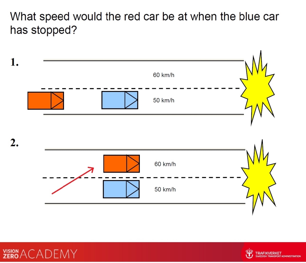 W tym momencie na drodze dzieje się coś nieprzewidzianego. Samochody muszą hamować i robią to jednocześnie. – Czy wiecie państwo z jaką prędkością będzie się poruszał pomarańczowy samochód [jadący „tylko” 10 km/h szybciej – red.], gdy niebieski zdąży zahamować? – zapytał Svensson.