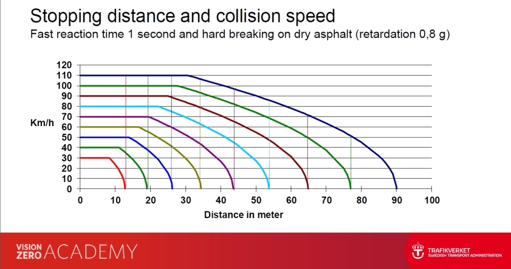 Svensson zaznaczył, że wynika to z prostego wzoru na energię kinetyczną, którego każdy uczył się w szkole, zgodnie z którym przyrost prędkości powoduje zwielokrotniony przyrost energii poruszającego się ciała, w tym wypadku samochodu. W drugą stronę, zatrzymanie trwa dużo dłużej. Różnica między 50 km/h, a np. 70 km/h jest jeszcze większa.