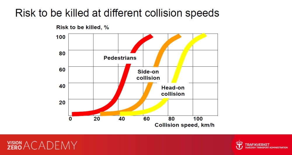 Ze szwedzkich statystyk wynika, że pieszy uderzony przez auto poruszające się z prędkością 30 km/h raczej przeżyje. Potem śmiertelność dramatycznie rośnie. Auto rozpędzone np. do 70 km/h prawie zawsze przejedzie pieszego śmiertelnie.
