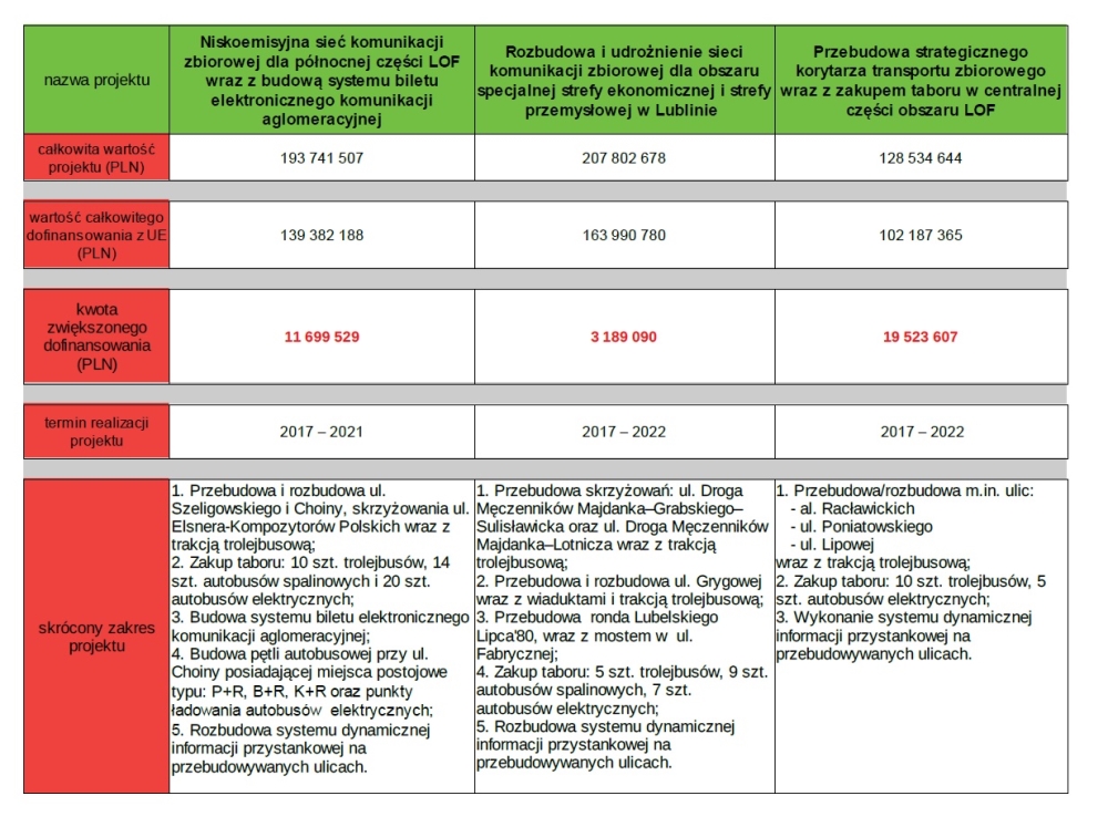 Przyznane środki finansowe przyczynią się do poprawy mobilności transportowej oraz upłynnienia ruchu w mieście. Przełoży się to na realne korzyści dla mieszkańców tj. poprawę komfortu oraz skrócenie czasu podróżowania komunikacją miejską. – Nowoczesna, ekologiczna komunikacja miejska z korzyścią dla mieszkańców i środowiska – taki efekt osiągnie Lublin dzięki dodatkowym środkom unijnym, które pozwolą na kontynuację rozwoju nisko i zeroemisyjnego taboru komunikacji miejskiej. To kolejny krok Lublina w kierunku szeroko pojętej elektromobilności – mówi Krzysztof Żuk, prezydent Lublina.