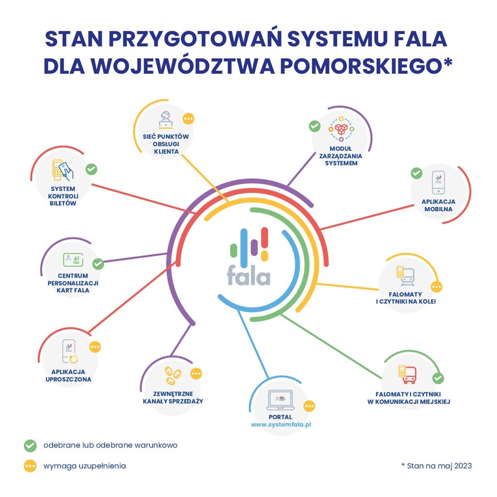 System, który w marcu dostarczyła firma ADS, został zweryfikowany. Przenalizowano kilkaset jego funkcjonalności. Oprócz narzędzi służących pasażerom, jak aplikacja, portal pasażera czy falomaty i czytniki, konieczne jest uruchomienie m.in. systemu kontroli biletów i oprogramowania do Punktów Obsługi Klienta, Dyspozytorni czy Centrum Personalizacji Kart FALA.