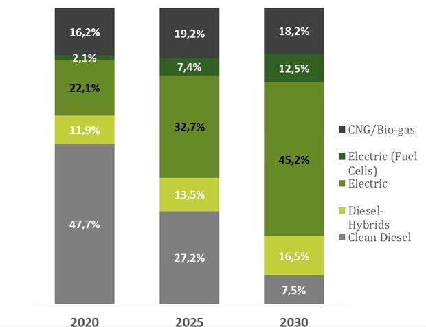 Szacuje się, że w perspektywie najbliższych 10 lat segment autobusów nisko- i zeroemisyjnych wzrośnie do poziomu 80% całego rynku autobusowego, głównie kosztem spadku udziałów napędów tradycyjnych. Solaris jest dobrze przygotowany do tej zmiany i już w perspektywie kilku najbliższych lat co najmniej połowa produkcji Spółki będzie nakierowana na produkcję autobusów z alternatywnymi napędami.